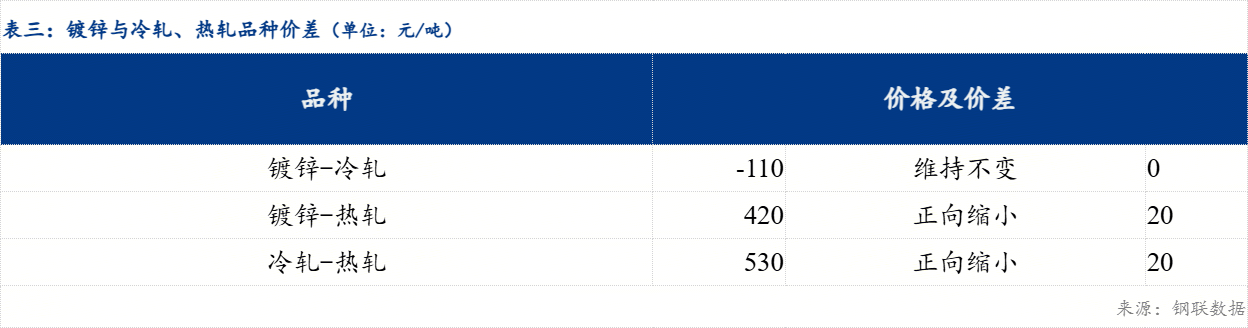 区域价差来看,天津-沈阳冷轧板卷区域价差扩大10元/吨,沈阳-哈尔滨冷轧板卷区域价差扩大20元/吨;天津-沈阳镀锌板卷区域价差维持不变,沈阳-哈尔滨镀锌板卷区域价差维持不变。品种价差来看,镀冷品种价差维持不变;镀热品种价差缩小20元/吨;冷热品种价差缩小20元/吨 。