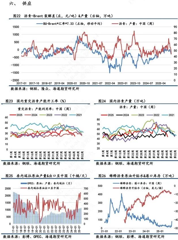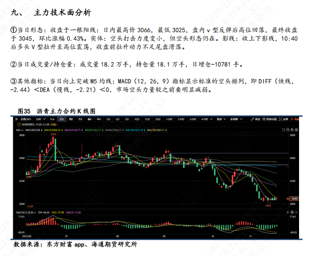 【5】短期展望:基本面上,价格依旧弱势看待,自身上行空间仍受制于需求减弱和库存压力两方面影响,关注冬储行情是否起色。年底前OPEC 增产冲击油价重心,沥青大概率跟跌重心下移。技术面上,沥青价格底部震荡,往下走的空间有限,预期弱势震荡。
