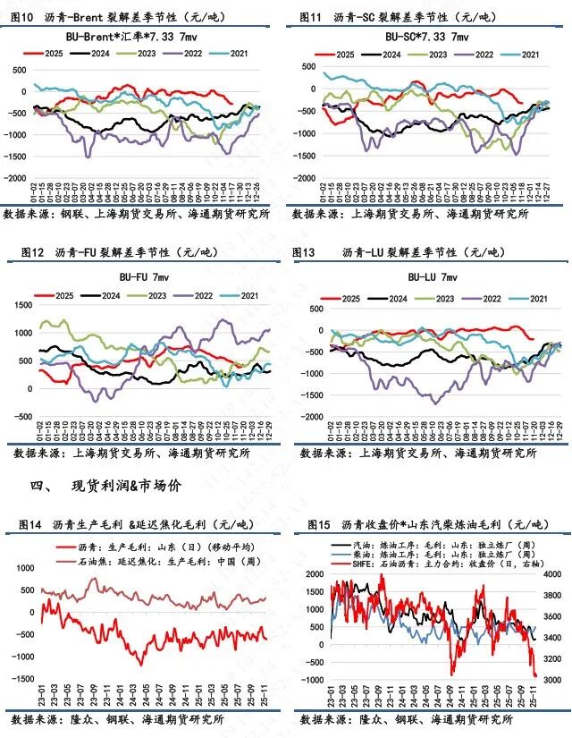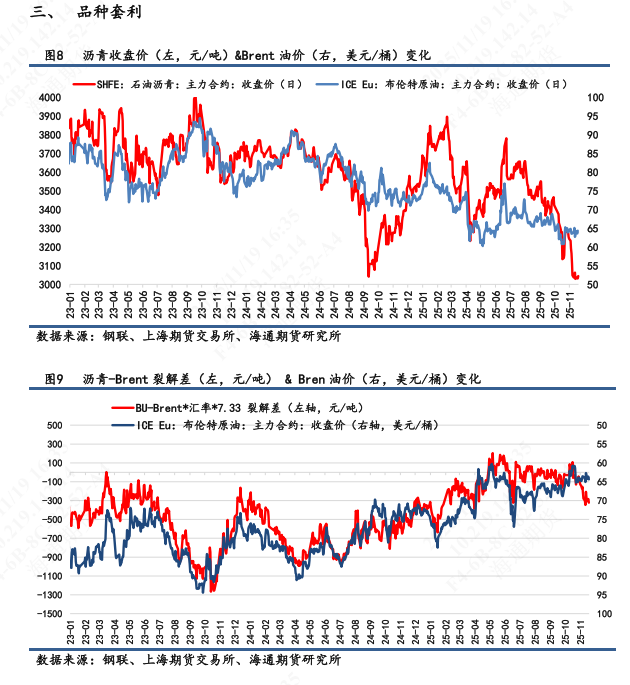 【2】现货市场:①山东重交沥青市场价为3030元/吨,环比持平,7天累计 0.7%。山东基差为-15元/吨,7天累计 11元/吨,基差季节性回落幅度收窄。②华东重交沥青市场价为3270元/吨,升水期货。华东基差为225元/吨,7天累计-79元/吨。