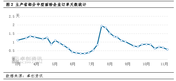 自11月下旬开始,面粉企业订单水平再次转少,截至12月5日,卓创资讯监测的主产省部分中型面粉企业订单天数为0.56天,较两周前再减0.15天。从图2可以看出,近月面粉订单天数处于相对低位水平,说明下游采购需求不集中,厂家订单相对分散,并且随着新订单的减少,面粉库存陆续有增,一定程度上牵制面粉企业加工积极性,阶段性加工需求略有减弱。