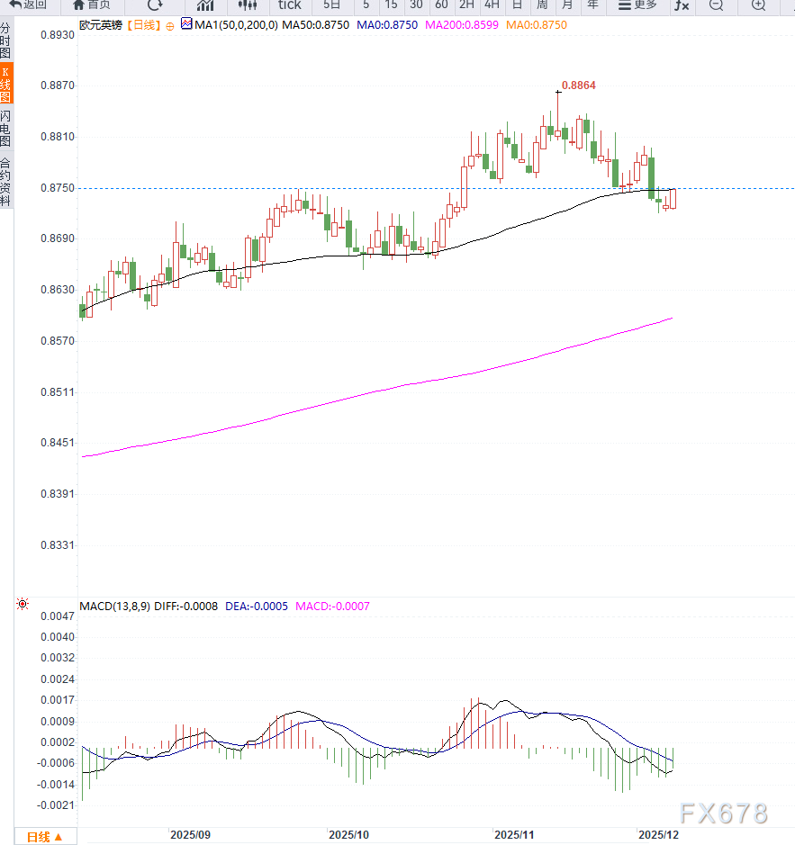 从日线图结构来看,EUR/GBP汇价企稳于0.8725附近支撑上方,并向0.8750区域反弹,技术面偏向多头。K线运行在20日均线之上,表明短线动能保持稳定;RSI指标回升至50上方,显示买盘力量增强。