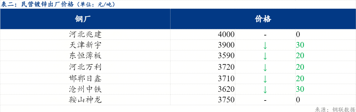 今日北方民营钢厂镀锌出厂指导价在3590-4000元/吨。