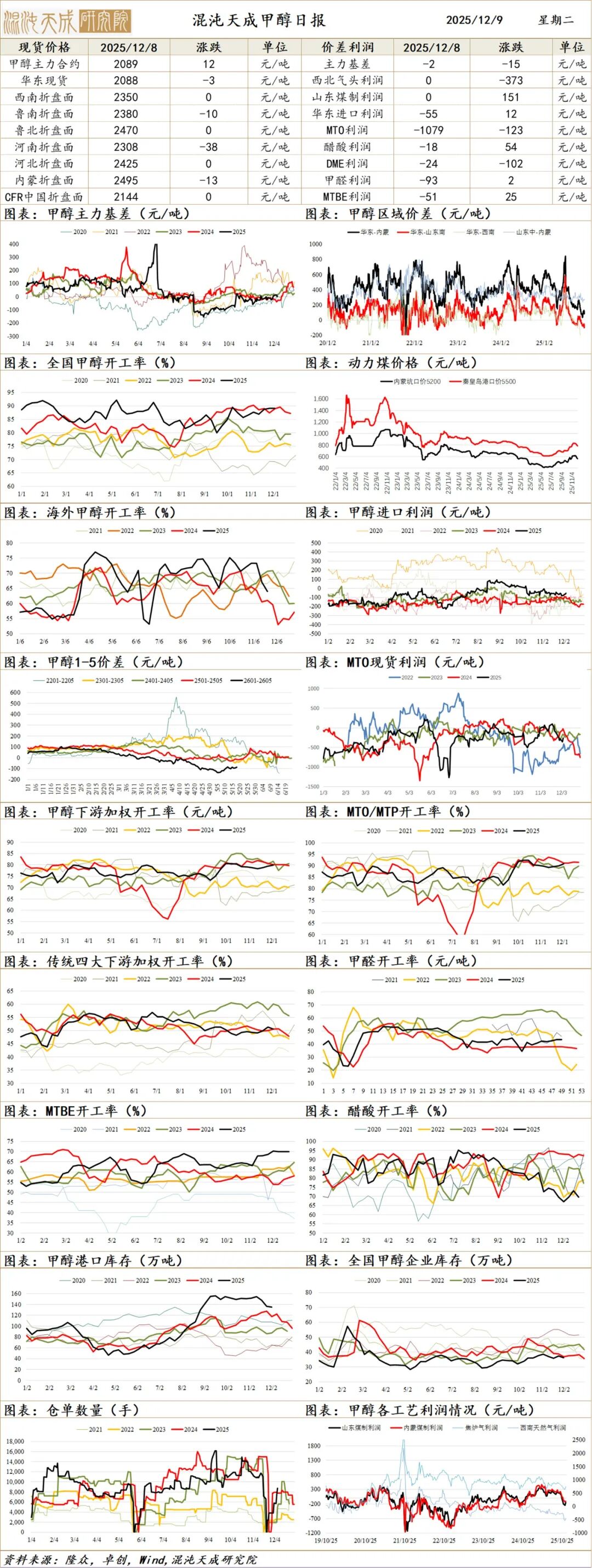 2、需求下降空间有限,但库存仍偏高。MTO利润高位预计开工持稳,近期有装置停车计划影响当前1%真实需求,年底关注联泓新投产兑现情况;传统需求偏弱下降空间有限;另当前甲醇燃烧、化工性价比上升。目前看到港和浮动仓仍在高位,本周港口库存小幅降至135万吨,到港量大幅上升,去库略超预期,预计至12月底到港均在高位。