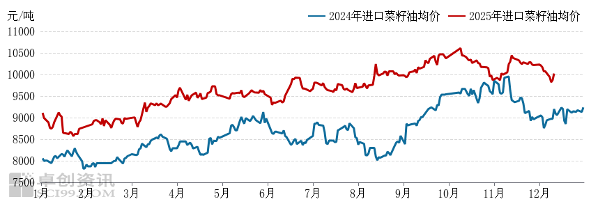 图2 2024-2025年国内进口三级菜籽油均价走势图