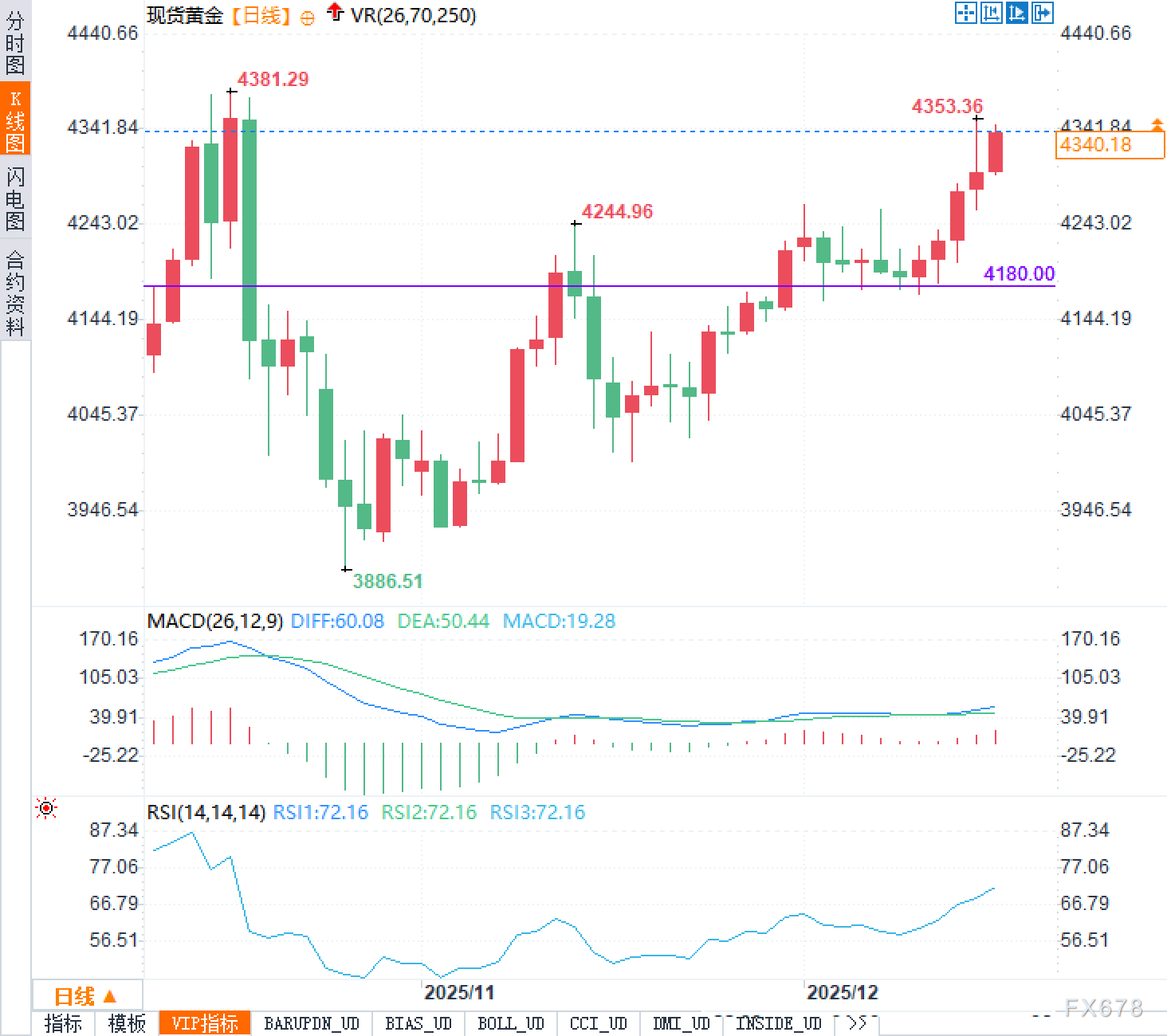 日线级别观察,金价创下3886.51美元的阶段性低点后展开反弹,当前靠近4353.36美元高位。相对强弱指标显示,RSI数值已攀升至72附近,进入传统定义的超买区域边缘,这表明短期内价格动能较为充沛,但也积累了一定的技术性回调压力。MACD指标则显示DIFF线与DEA线均处于零轴上方,且MACD柱状线维持正值运行,中期趋势偏向多头的格局尚未发生根本性改变。