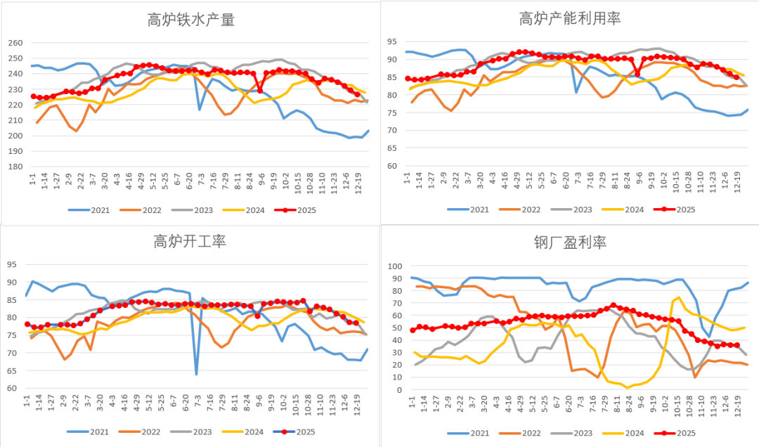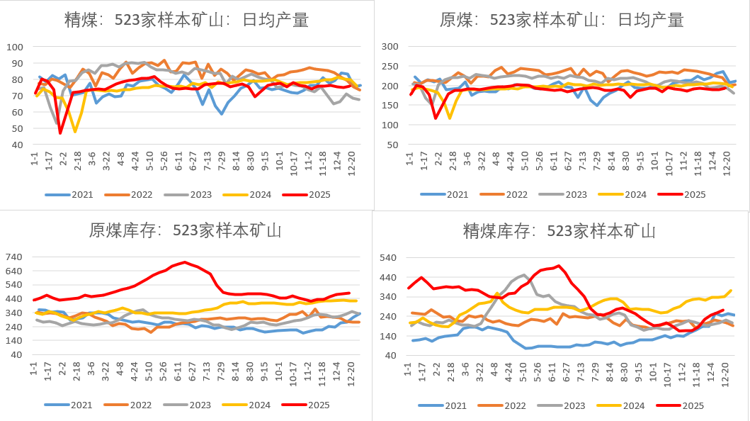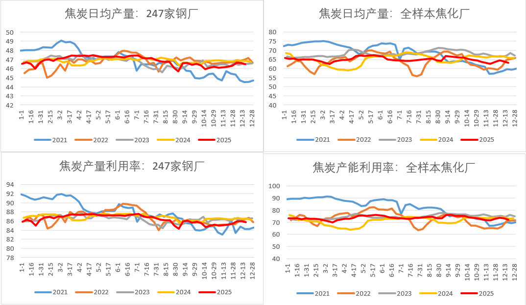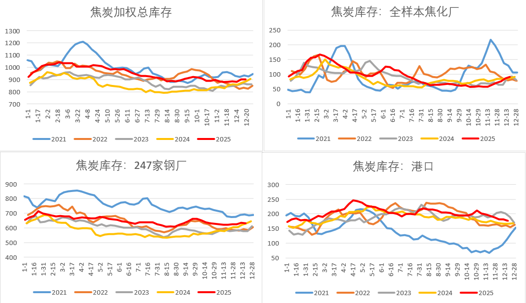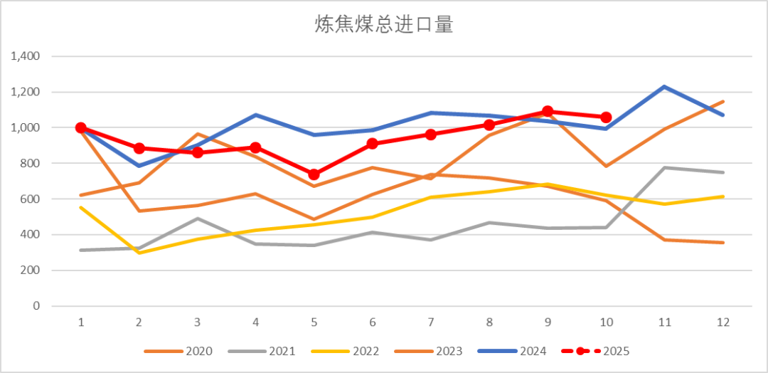 焦煤方面,供应端宽松压力持续显现。国内焦煤产量预计基本持平,年底煤炭保供稳产政策发力将保障坑口产量稳定,而进口端增量更为明确,蒙煤、澳煤进口均有增加预期,预计2026年焦煤进口量将增至1.2亿吨,“蒙煤 俄煤”的进口结构延续,将对国内市场形成明显补充。需求端,随着钢厂高炉检修增多,铁水产量下滑趋势将延续,焦企采购谨慎情绪难以缓解,焦煤需求支撑减弱。库存方面,当前焦煤总库存虽低于2024年同期,但供需宽松格局下库存累积压力逐步显现。预计2026年焦煤期货价格波动区间为900-1400元/吨,整体维持弱势运行。
