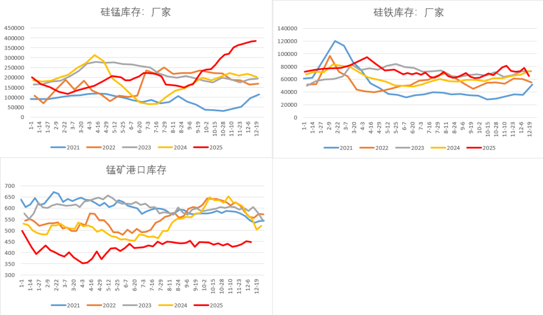 供应端,铁合金产量虽维持高位回落态势,但总体过剩压力延续。主产区电价企稳、焦炭及兰炭价格低位回暖,使得铁合金成本低位上行空间受限,成本端对价格的支撑逐步增强。锰矿方面,港口库存虽小幅回升,但总体仍处于偏低水平,对锰硅价格形成一定阶段性支撑。
