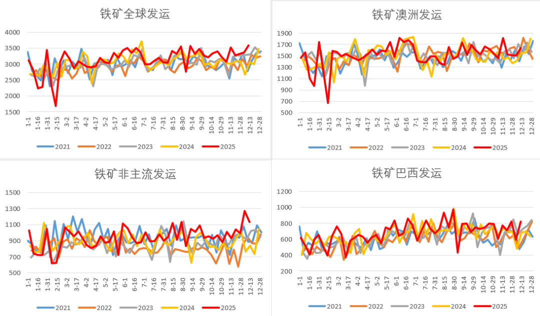 2025年铁矿石市场供需边际宽松,价格波幅收窄,港口库存持续累积至近五年同期高位。2026年,铁矿石市场将进一步陷入供需宽松格局,价格面临持续下行压力。