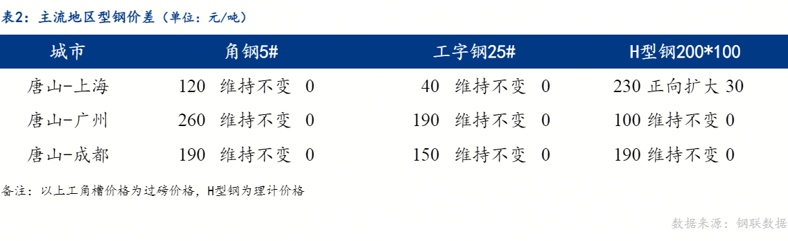 从区域价差来看,今日唐山与上海角钢、工字钢价差维持不变,H型钢价差正向扩大,唐山与广州角钢、工字钢、H型钢价差维持不变,唐山与成都角钢、工字钢、H型钢价差维持不变。