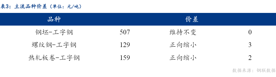 从品种价差来看,今日工字钢与钢坯价差维持不变,工字钢与螺纹钢、热轧板卷价差正向缩小。