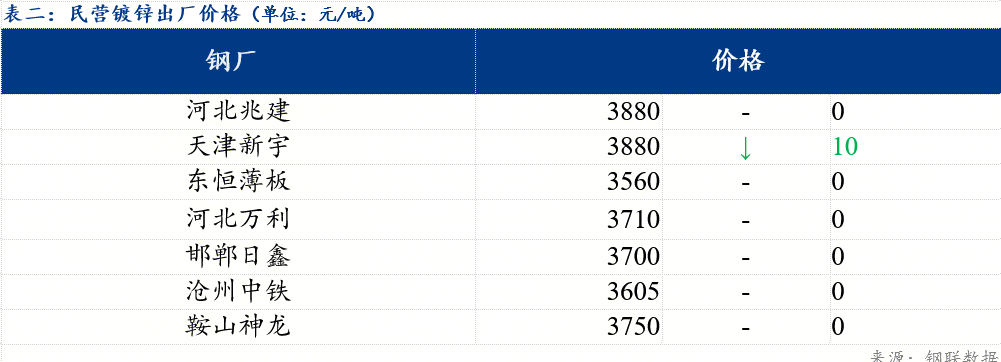 今日北方民营钢厂镀锌出厂指导价在3560-3880元/吨。