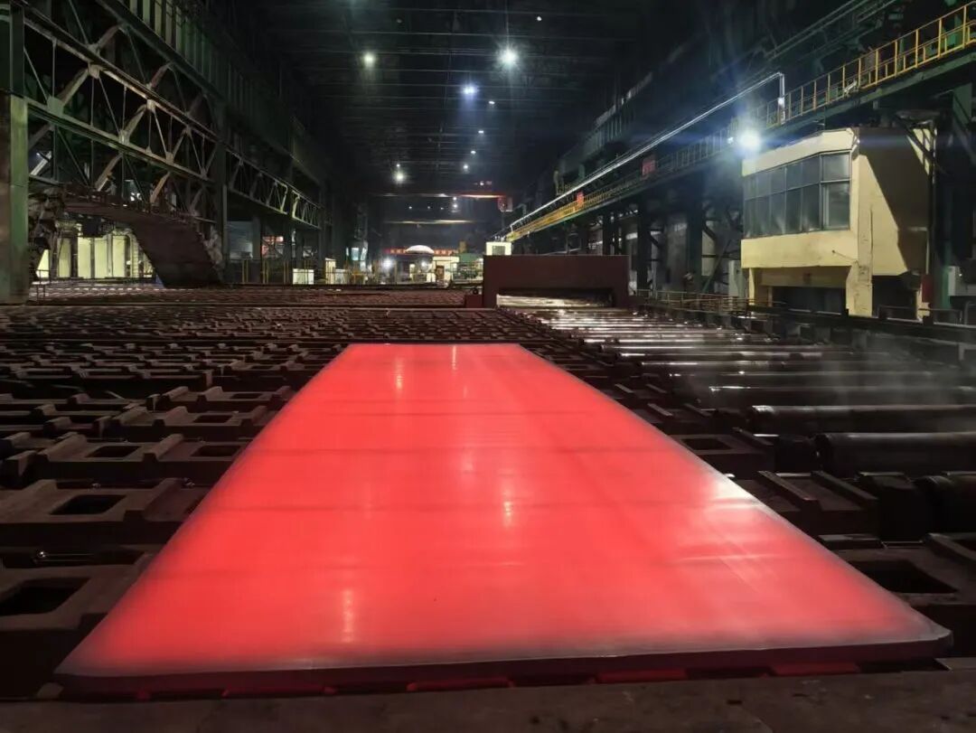 轧制试生产过程中,2800机组秉持“精料、精烧、精轧、精剪”理念,严格按照既定工艺方案执行,从轧辊凸度、轧制区域冷却水调整、精整剪切等方面入手,制定详细针对性措施。在加热环节,坯料入炉前认真抽查坯料尺寸,逐块检查表面质量,核对长宽厚信息,测量对角线长度,严格按照《操作要点》装炉,合理匹配入炉时机,保障坯料心部与表面温度均匀,避免成分偏析。在轧制环节,技术部门牵头明确开轧温度、终轧温度的控制标准,优化道次压下量分配,操作团队全程紧盯板形变化,精准调整辊型与冷却水参数,严控轧制节奏,成功克服钢板温降快、轧制压力大、板形不易控制等技术难点;精整工序专人把控剪切间隙,实施二次剪切工艺,避免圆盘剪剪切卡钢、钢板运输扎入辊道下、钢板吊伤等事故发生。