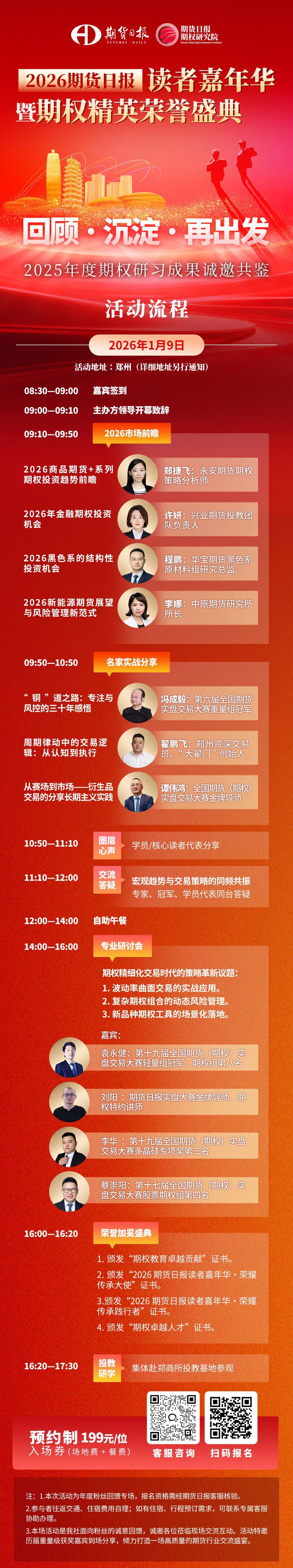 本次活动将以对未来的前瞻拉开序幕。来自期货公司的四位一线研究专家,将分别聚焦“商品期货与郑商所期权投资趋势”“金融期货发展”“黑色系结构性机会”以及“新能源期货与风险管理”,为您立体勾勒2026年的宏观图景与产业脉络,为交易提供制定全年战略的顶层视角。