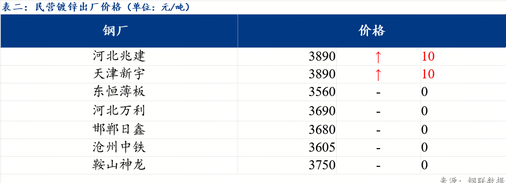 今日北方民营钢厂镀锌出厂指导价在2560-3890元/吨。
