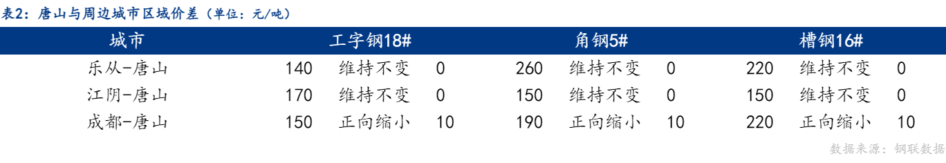 从区域价差来看,乐从、江阴市场与唐山市场型材价差维持不变,成都市场与唐山市场型材价差正向缩小。