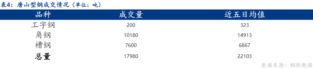 2、成交量为20家型钢厂当日成交,其中包括工字钢6家、角钢7家、槽钢7家。