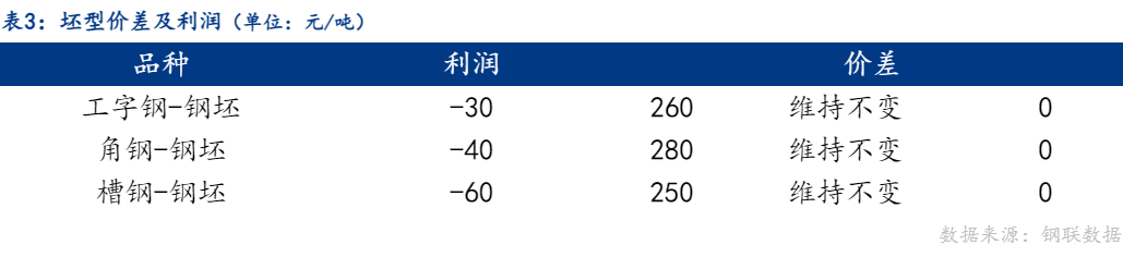 从品种价差来看,工字钢、角钢、槽钢与钢坯价差维持不变。