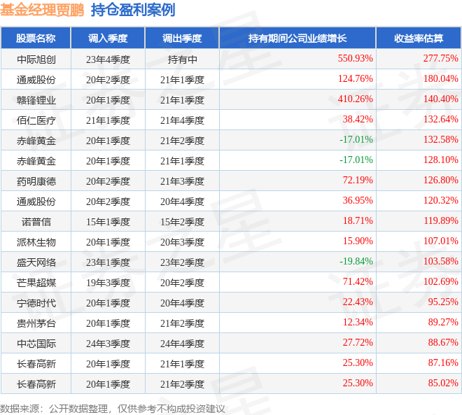 贾鹏管理的银华多元动力灵活配置混合基金在23年4季度买入中际旭创,已连续持有2年又0个季度。持有期间的估算收益率为277.75%,持有期间中际旭创在2023年到2025年的中报归属净利润增幅达550.93%。