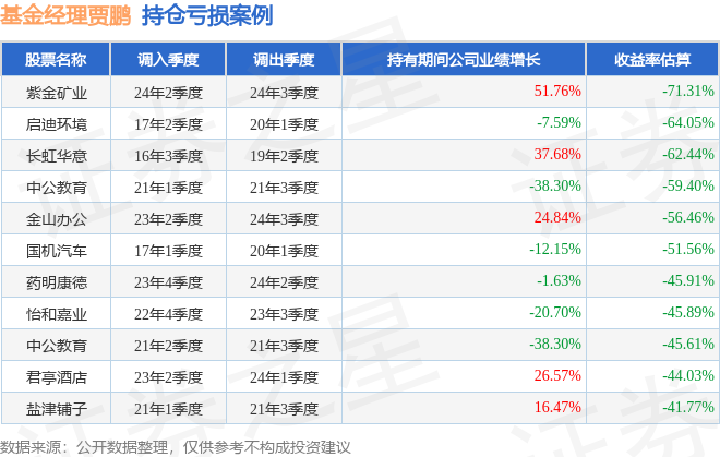 贾鹏管理的银华多元视野灵活配置混合基金在24年2季度买入紫金矿业,在持有1个季度后在24年3季度卖出。持有期间的估算收益率为-71.31%,持有期间紫金矿业在2023年到2024年的年报归属净利润增幅达51.76%。