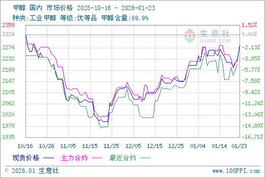 截至1月23日收盘,郑州商品交易所甲醇期货收盘价上涨。甲醇期货主力合约2605开盘于2251元/吨,最高价为2303元/吨,最低价为2246元/吨,尾盘收于2298元/吨,较上一交易日结算盘上涨66,涨幅2.96%。成交量1349180,持仓量806994,日增仓-10177。