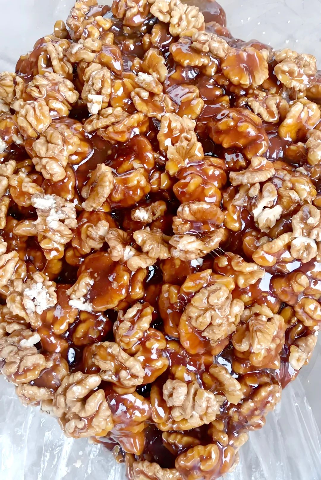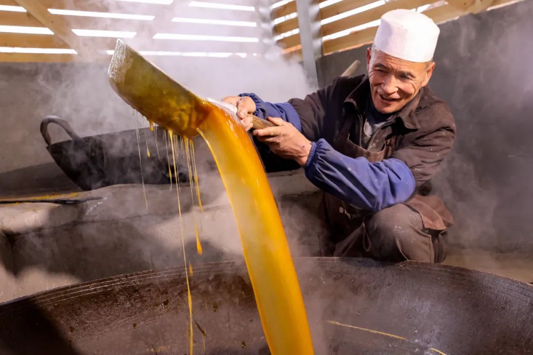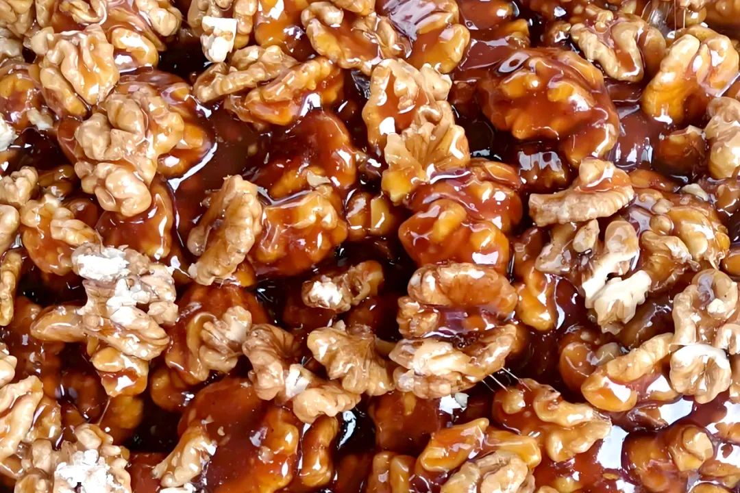 制作核桃糖技术娴熟的李大叔说起制作过程,嘴角不由向上翘起,撩过一丝不易觉察的得意之色,他说,制作它的过程,像是一场与时间的对话,每天早上,要把攒了整个秋天的核桃仁小心翼翼地摊在簸箕里,在冬日暖阳下反复翻晒,直到每颗果仁都变得像琥珀般透亮,然后等待春节就发好的麦芽糖,才开启这场味觉的魔法。熬糖讲究“看火色”,根据糖浆颜色变化判断火候:火候的掌控,全凭经验与感觉,多一分则焦,少一分则嫩,琥珀色的糖液在锅中缓缓流淌,随着温度的升高而渐渐变得黏稠,初沸时如鱼眼,接着如蟹眼,最终达到“滴水成珠”的境界,待糖浆达到完美的状态,再迅速加入烤得香气四溢的核桃仁,快速用木勺翻拌,让每一颗核桃都均匀地裹上甜蜜的外衣。在二者完美重合后,将这滚烫的混合物倒入刷油的模具中,趁热塑形、切块。这样保留了核桃的营养活性,又创造出令人愉悦的口感层次,这个过程如同赋予糖块灵魂,让最终的成品既有玻璃的脆感,又保留着焦糖的绵密。