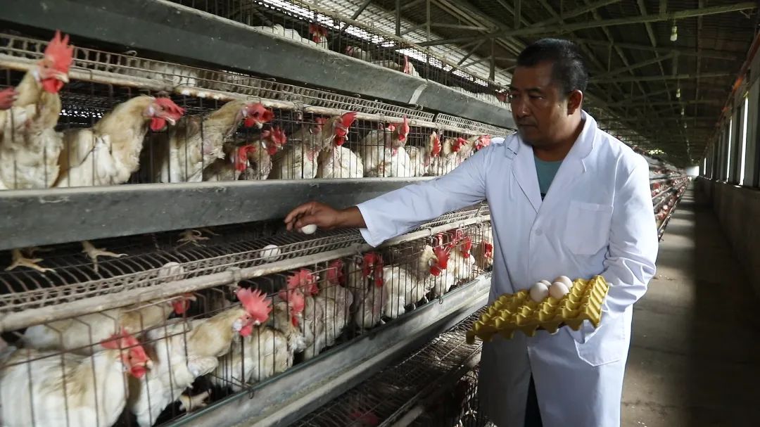 在现代化蛋鸡养殖场里,村民李三块熟练地收捡着鸡蛋。这份家门口的工作不仅让他月入超3000元,还能照顾家里的老人和孩子。