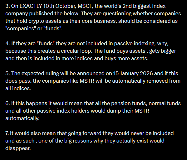 这指数威胁此事影响巨大。全球第二大指数提供商MSCI于2025年10月10日宣布,正在审查像Strategy这样的DAT是否符合运营公司或投资工具的定义。