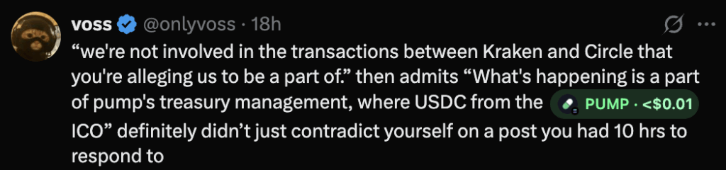 用户 Voss 指出声明中存在明显的矛盾之处。回复中提到,Sapijiju 先是声称没有参与 Kraken-Circle 的交易,随后又承认 USDC 从 PUMP ICO 中转移出去。