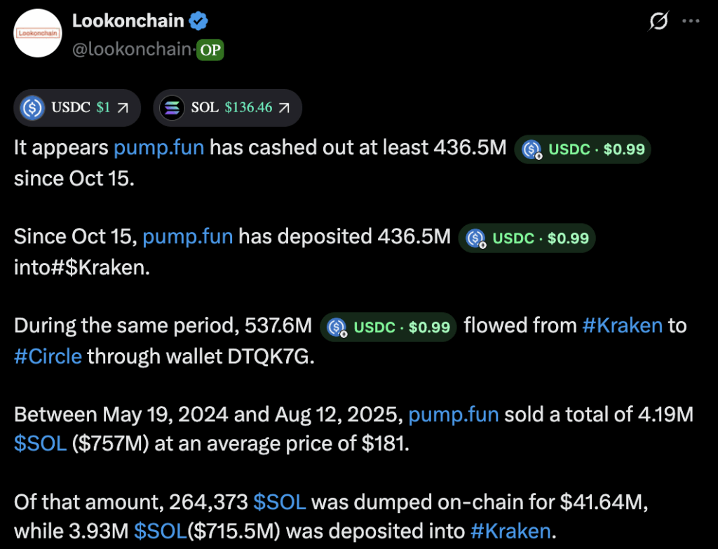 Lookonchain 公布的数据显示,自 10 月 15 日以来,Pump.fun 已向 Kraken 存入了 4.365 亿美元的 USDC。