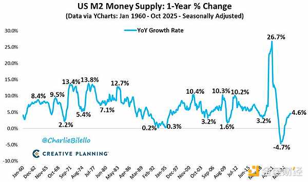 查理解释称,此次创下历史新高是因为“过去一年美国货币供应量增长了4.6%,这是自2022年7月以来最大的同比增幅”。