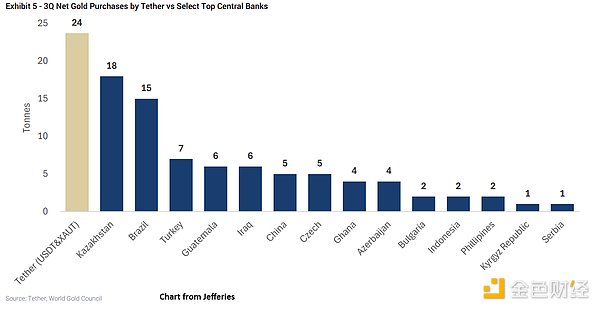 Tether在黄金市场的影响力今年显著上升。根据Jefferies的数据,在截至9月30日的两个季度中,这家数字资产公司的购金量超过了官方央行的购买规模。