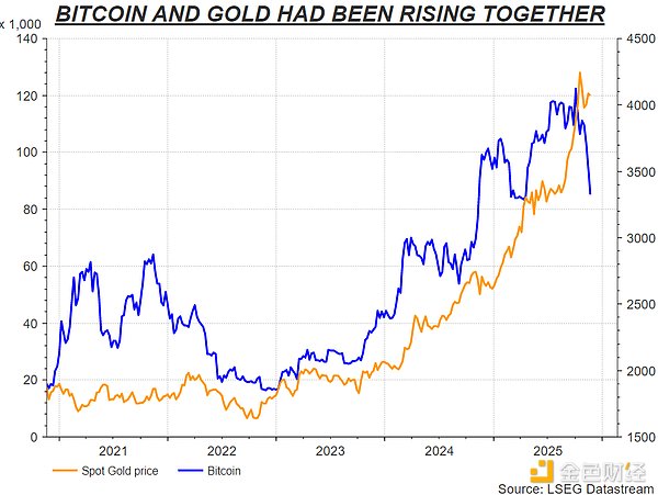 两者的共同叙事是对主要货币超发和贬值的担忧,买家声称囤积这两类资产是基于"价值储存"考虑,因其供应有限而非固定收益。然而比特币等加密代币虽在过去十年爆发式增长,但仍然极度波动且高度投机。今年秋季,即便针对主要货币的焦虑转向日元,比特币却跟随科技股"风险规避"抛售,六周内暴跌约三分之一。