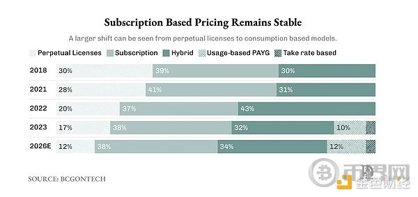 云服务使计算、数据和 API 平台的毫秒级计费成为常态,它们出售的信用额度随实际工作量扩展 —— 收入正逐渐与网络能够观察到的最小单位挂钩。2018 年,不到 30% 的软件采用基于使用量的定价;如今,这一比例已接近 50%,同时订阅制仍以 40% 的占比保持主导地位。