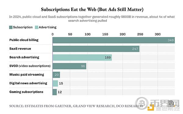 左上角是混乱的 “随意浏览型网络”:不定期的新闻 binge 阅读、链接跳转、支付意愿低。订阅制过于繁琐,而按点击微支付则因决策和交易摩擦而崩溃。广告成为了融资层,聚合了数百万次微小、不一致的浏览量。全球广告收入已突破 1 万亿美元,其中数字广告占 70%,这表明互联网的很大一部分都处于这个低承诺区间。