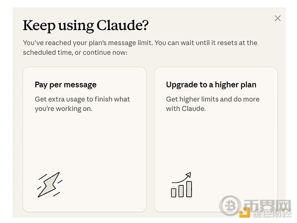 你已经可以看到消费级 AI 正在向这个方向发展:当你达到 Claude 的消息限制时,它不会只显示 “限制已达,下周再来”,而是在同一屏幕上提供两个选项:升级到更高的订阅套餐,或按条付费完成当前操作。