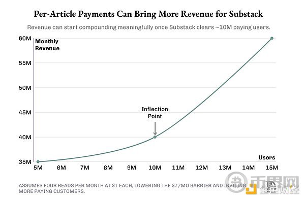 Substack 拥有 5000 万用户,转化率为 10%,即 500 万订阅用户,每月支付约 7 美元。当付费订阅用户翻倍至 1000 万时,Substack 可能会从微支付中获得更多收入 —— 更低的摩擦会让更多临时读者转向按篇付费,加速收入增长曲线。