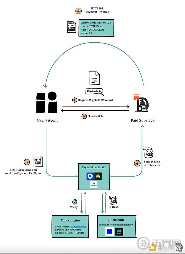 想象一下 Substack 对一篇付费文章收取 0.50 美元:当你点击 “付费阅读” 按钮时,Substack 返回一个 402 代码,包含价格、接受的资产(如 USDC)、网络(如 Base 或 Solana)和相关政策,格式如下: