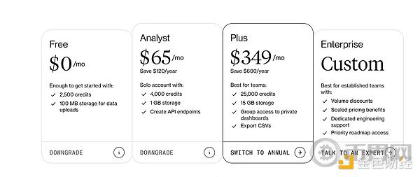 这就是为什么基于席位的产品正逐渐转向计量制:保留协作和支持的基础计划,同时对重度使用收费。例如,Dune 每月提供有限的信用额度,小型简单查询价格低廉,而运行时间更长的大型查询则消耗更多信用额度。