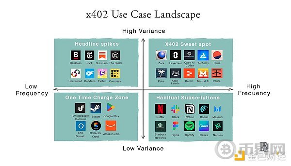 一旦网络支持原生支付,一个显而易见的问题是:它将首先在哪些领域普及?答案是高频使用、交易价值低于 1 美元的场景 —— 在这些场景中,订阅制会向轻度用户收取过高费用(每月最低订阅费成为门槛)。只要区块链费用可行,x402 可以按机器速度结算每一次请求,精度可达 0.01 美元。