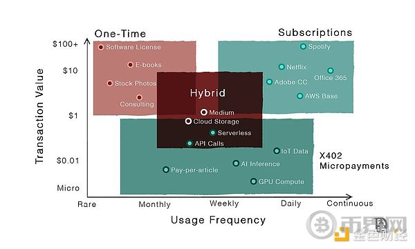 右上角是现代互联网的重心:LLM 查询、代理操作、无服务器突发流量、API 调用、跨链交易、批处理作业和物联网设备通信。使用量既持续又波动。基于席位的固定费用无法准确反映这一现实,但降低了付费启动的心理门槛 —— 轻度用户多付费,重度用户得到补贴,收入与实际消费脱节。
