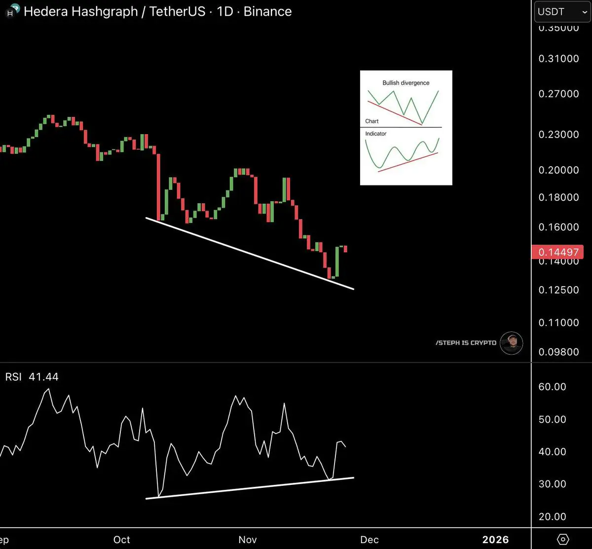Hedera价格在反弹至0.14-0.145美元支撑位上方后开始企稳。该价位曾是疲软点,但现在显示出强势迹象。在图表上,看涨背离正在形成。