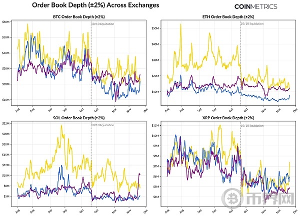 现货市场流动性在 10 月 10 日清算后未能恢复。主要交易所的挂单深度(±2%)至今仍比 10 月初低 30–40%,说明随着价格企稳,流动性仍未修复。由于挂单减少,市场更脆弱,轻微的交易就可能带来过度价格冲击,加剧波动并放大强平影响。