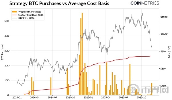 Strategy — — 当前最大的 DAT — — 持有 649,870 BTC(约占全供应的 3.2%),平均成本为 74,333 美元。如下图所示,Strategy 的增持在 BTC 上涨、其股价表现强劲时大幅加速,而近期则明显放缓,但并未成为主动出售力量。即便如此,Strategy 仍处于浮盈状态,成本低于现价。