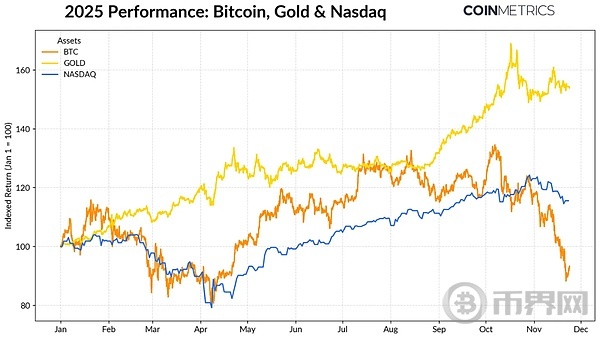 比特币与主要资产类别的表现差异正在扩大。黄金在创纪录的央行购金需求与持续的贸易紧张推动下,今年迄今上涨超 50%。与此同时,科技股(NASDAQ)在第四季度失去动能,因为市场重新评估美联储降息概率与 AI 驱动估值的可持续性。
