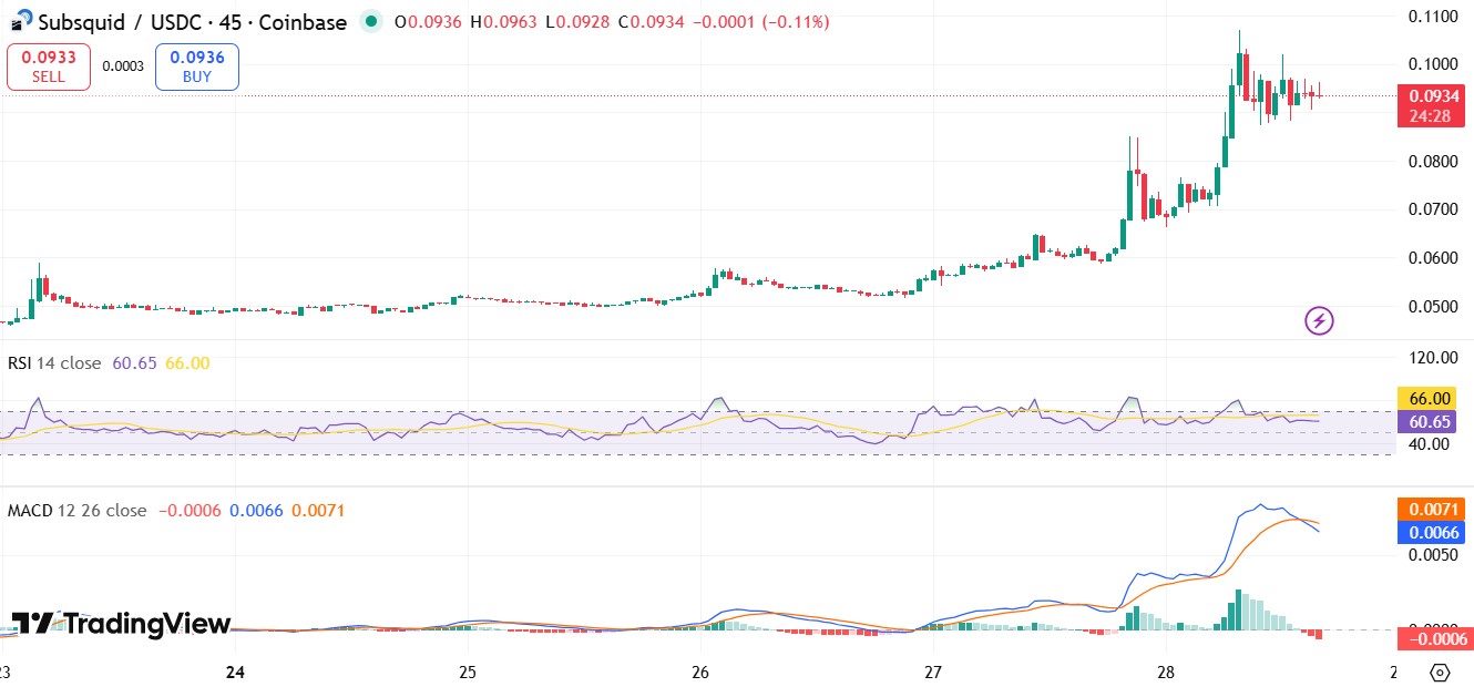 Subsquid 价格走势图显示,该资产开盘价接近 0.0619 美元,并迅速飙升至 0.10 美元附近。目前价格约为 0.095 美元,创下市场单日涨幅最强劲的纪录之一。