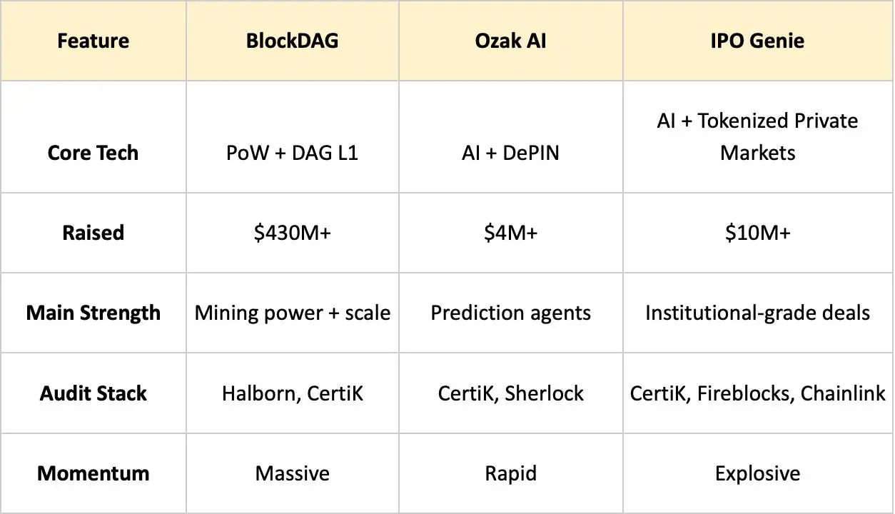 2025 年人工智能预售竞争与以往截然不同。没有一个明显的领头羊,而是三个截然不同的项目吸引了广泛关注:BlockDAG、Ozak AI 和首次公开募股 Genie($IPO)它们分别代表了人工智能和加密货币市场的不同部分。投资者现在正试图了解哪个项目最有希望成为2025年11月最佳加密货币,并有可能成为下一个周期表现最强劲的项目。