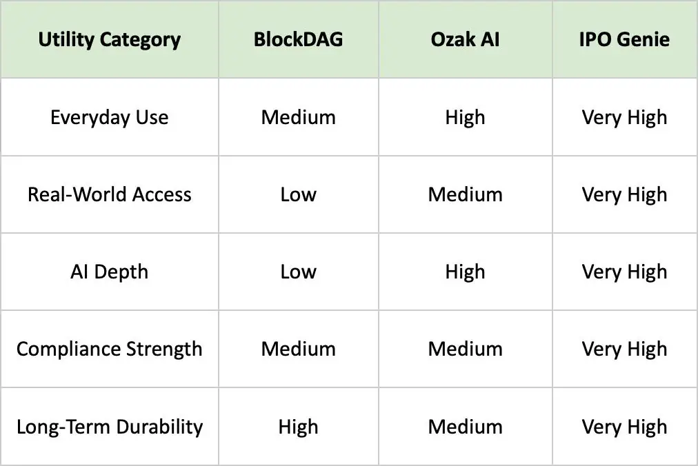 IPOGenie拥有最直接的现实世界路径。衡量这场竞赛的方式有很多种,例如规模、实用性、合规性和社区影响力。当所有因素并列比较时,最终结论就会更加清晰。