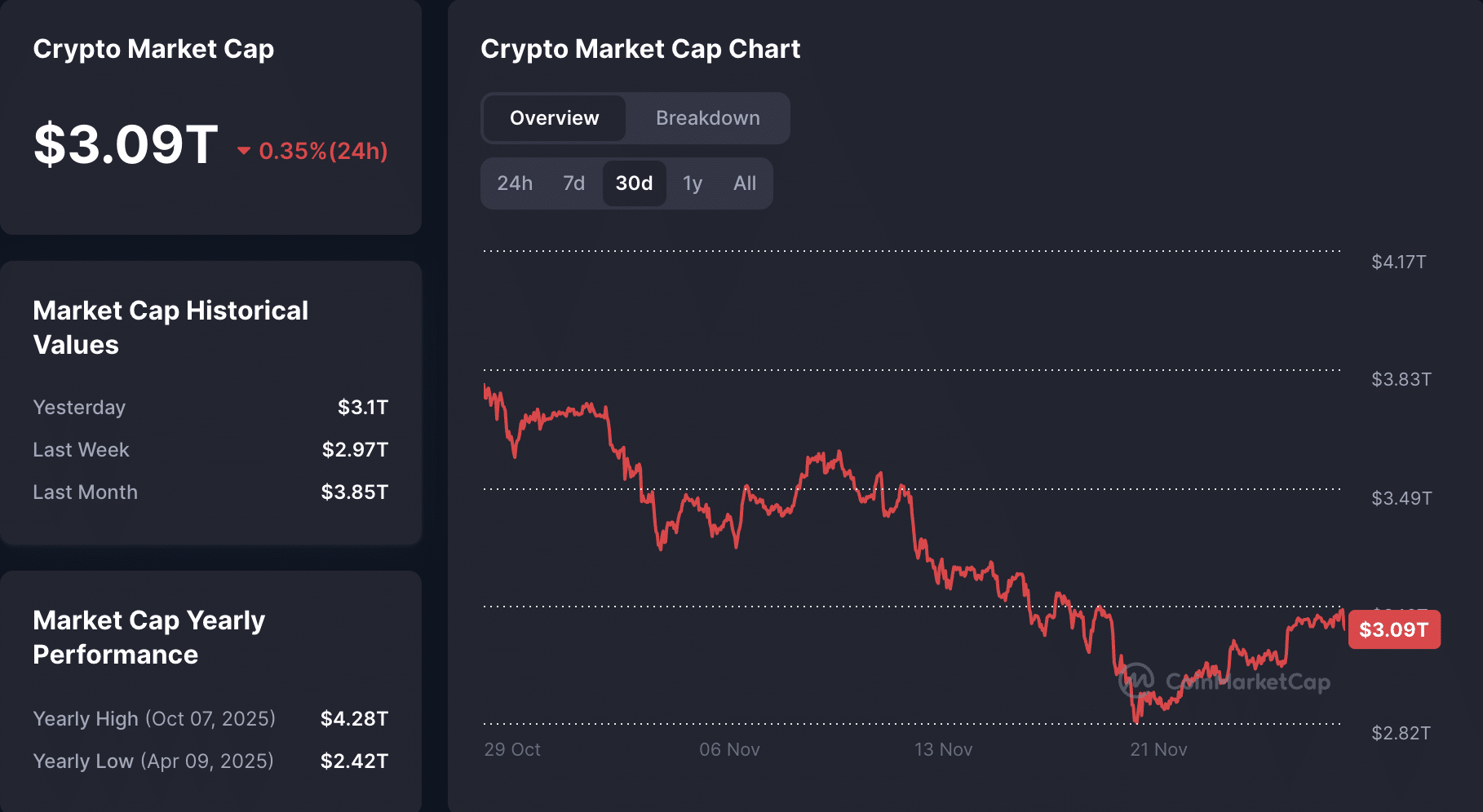 尽管市场情绪低迷,但加密货币总市值仍达到 3.09 万亿美元,虽然当日略有下降,但高于上周的 2.97 万亿美元。