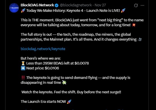 BlockDAG Keynote 4 正式上线后,加密货币市场突然升温。此次简报公布了有关技术、路线图、矿工和合作伙伴关系的重要更新,$BDAG 的预售价格也因此进入了全球关注的新阶段。