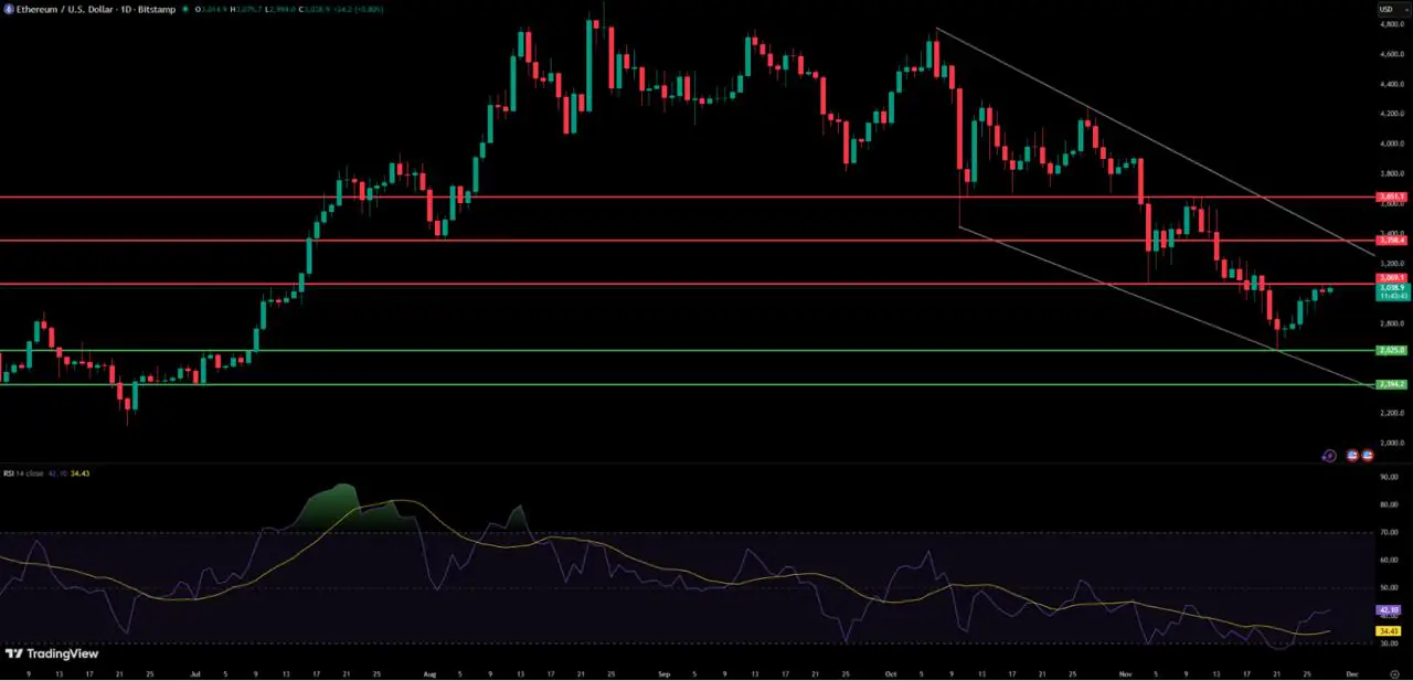 以太坊日线图显示出一个下跌通道,支撑位在 2,625 美元附近。关键阻力位在 3,070 美元附近,突破该阻力位可能引发反弹,目标位在 3,360 美元和 3,650 美元。然而,如果跌破 2,625 美元,以太坊可能会重新测试 2,400 美元附近的局部低点。RSI